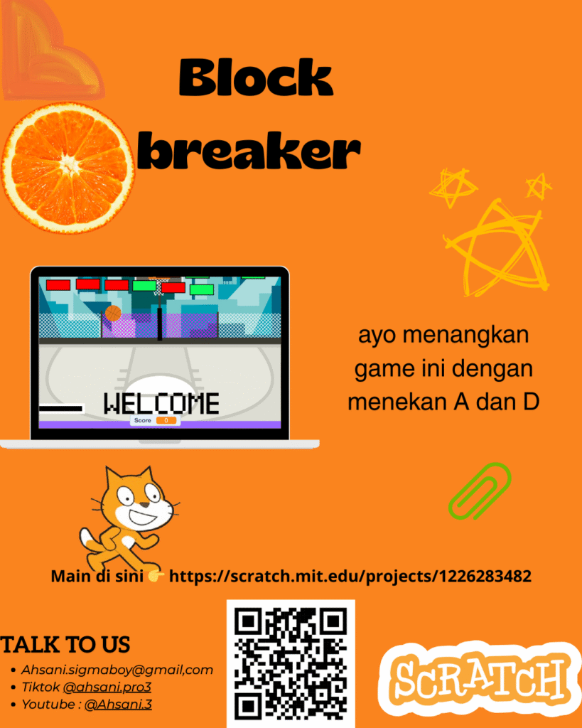 This Scratch project develops Block Breaker, a classic arcade game where players control a paddle to bounce a ball and break blocks on the screen. The project introduces concepts of angle control, collision detection, scoring, and increasing difficulty as levels progress.