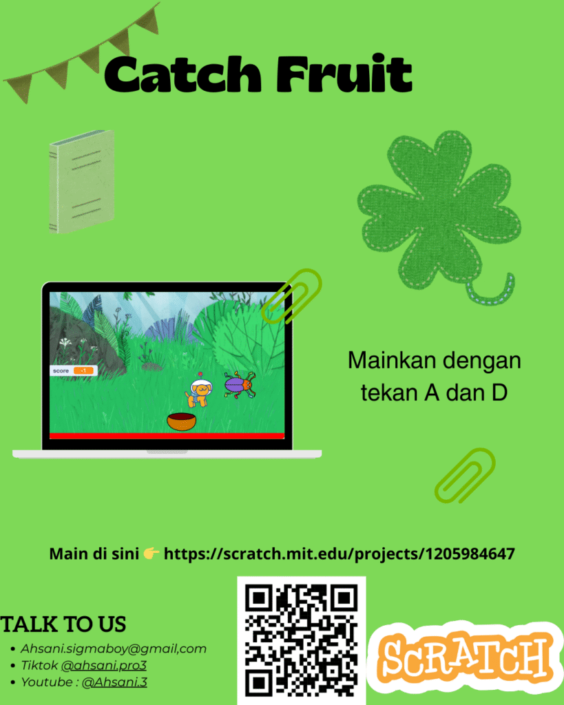 This Scratch project creates Catching Fruit, a simple reaction game where players move a basket to catch falling fruits while avoiding harmful objects. The project teaches basic controls, object cloning, scoring, and increasing difficulty based on the player’s performance.